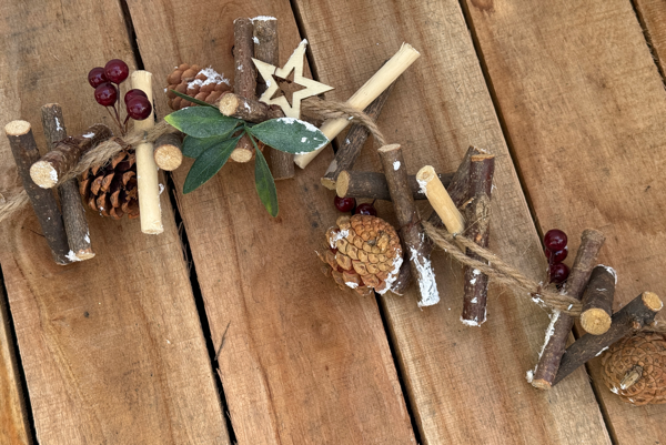 - Decorated with berries, stars, pinecones, leaves, and chunks of wood