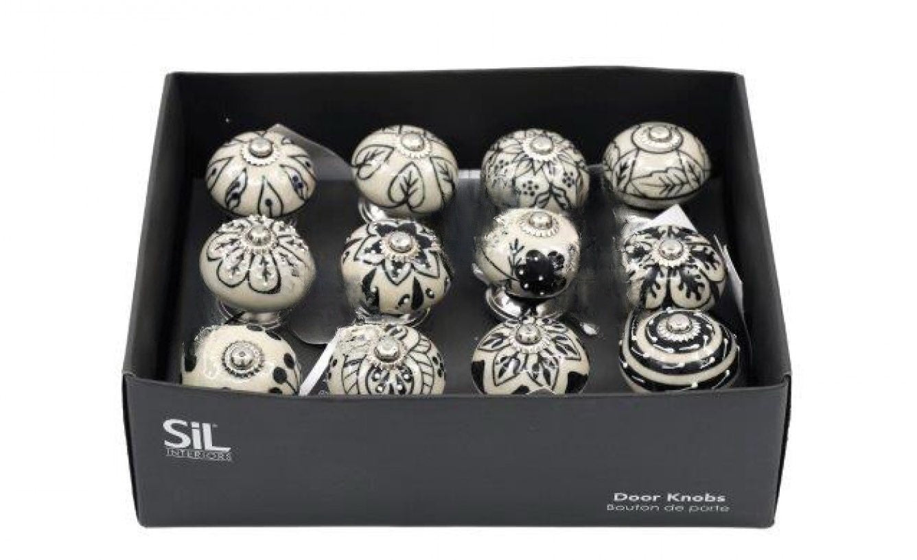 Enhance your cupboards and drawers with these beautiful hand-painted ceramic door knobs. Each knob features a unique design in black with a white background, adding a touch of style to your furniture. These knobs come with easy fittings and can be installed on doors up to 3.0cm thick. With a diameter of 40mm and a bolt length of 35mm, they are the perfect size for most furniture. Follow the simple installation instructions and give your home a fresh update with these stoneware and iron knobs!